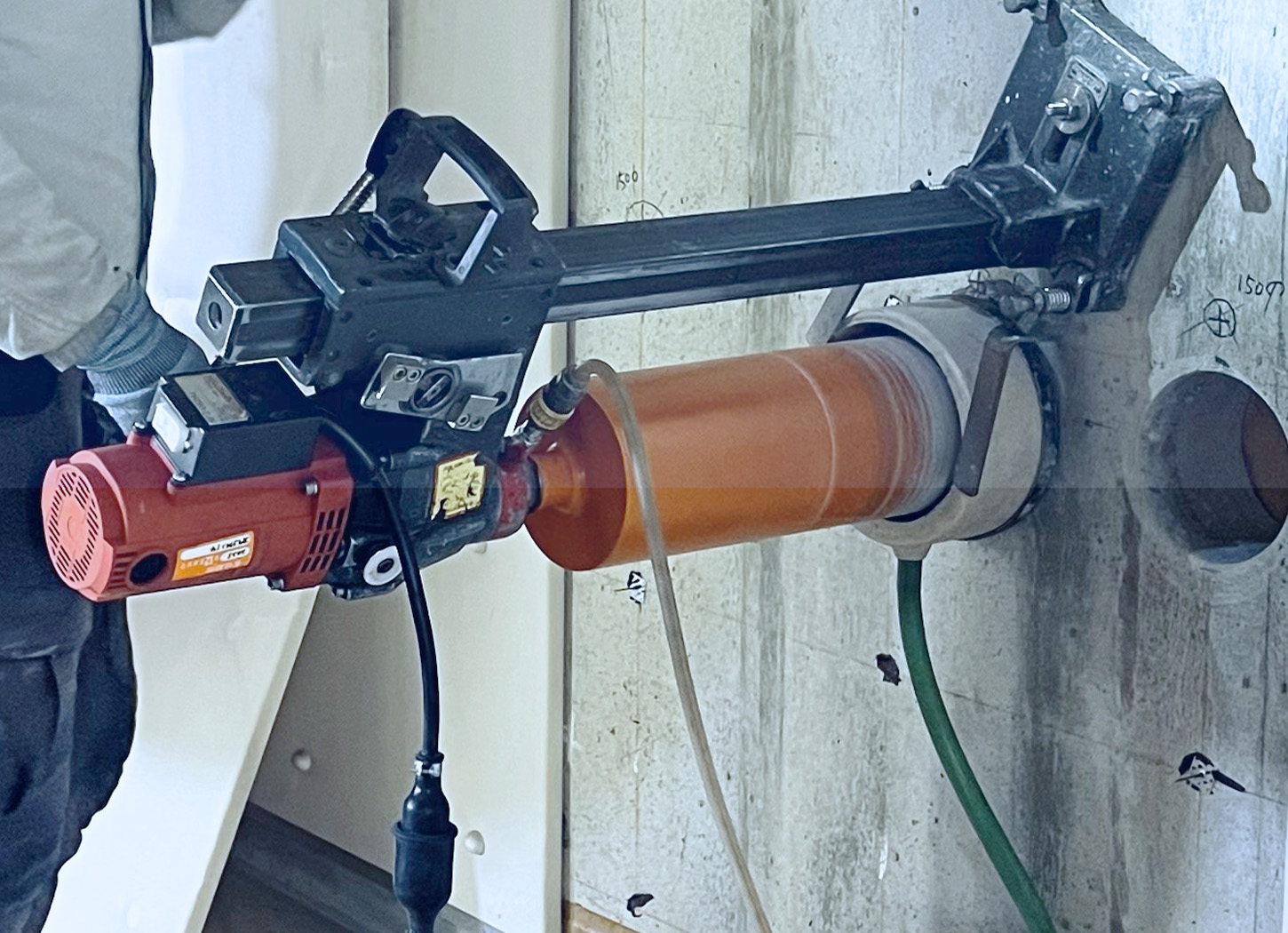 ダイヤモンドコア穿孔(コア抜き)工事とは、チューブの先端に大小さまざまなサイズのダイヤモンドビットを使用し、高速回転させることでコンクリート構造物に穴を開ける工法です。